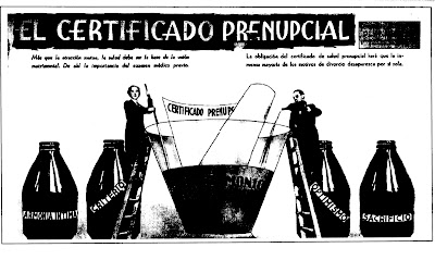 En el escrito se asegura que la ley aprobada ese año que imponía la obligatoriedad del certificado prenupcial en la Argentina traería aparejada la pervivencia de la pareja en el tiempo: si se somete el amor a la razón, la buena elección del cónyuge sólo puede traer felicidad eterna. En el dibujo la mujer y el hombre revuelven en un recipiente gigante la fórmula del buen matrimonio, que tiene al certificado de salud prenupcial como ingrediente principal, además de proporciones importantes de “armonía íntima”, “criterio”, “optimismo” y “sacrificio”. Se mezcla bien todo y pum para arriba: no puede fallar.